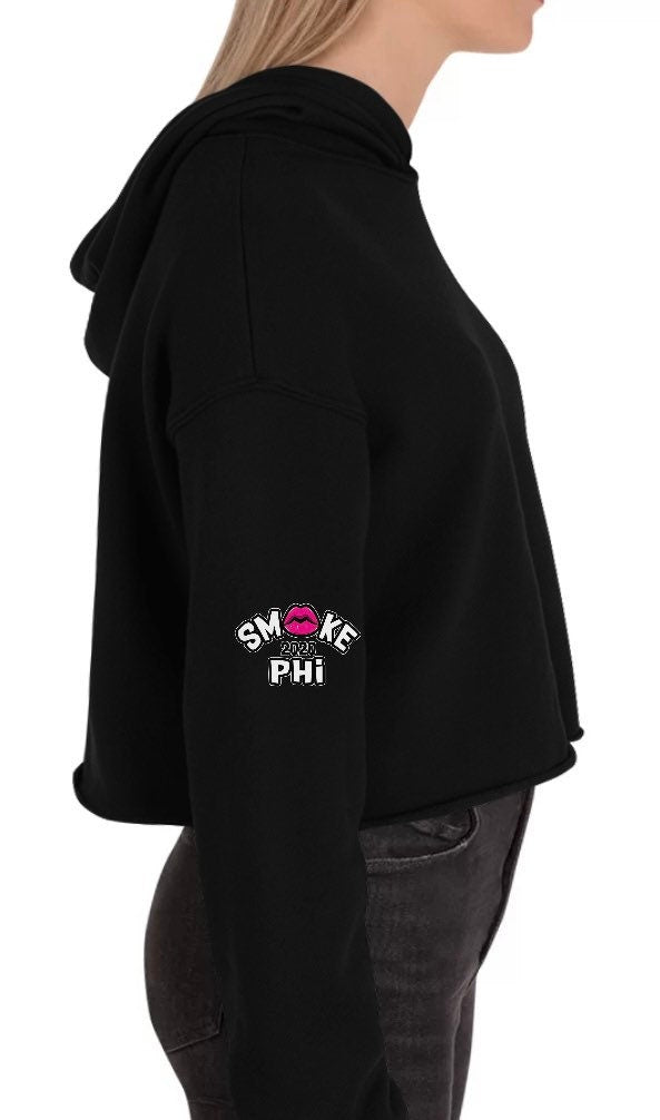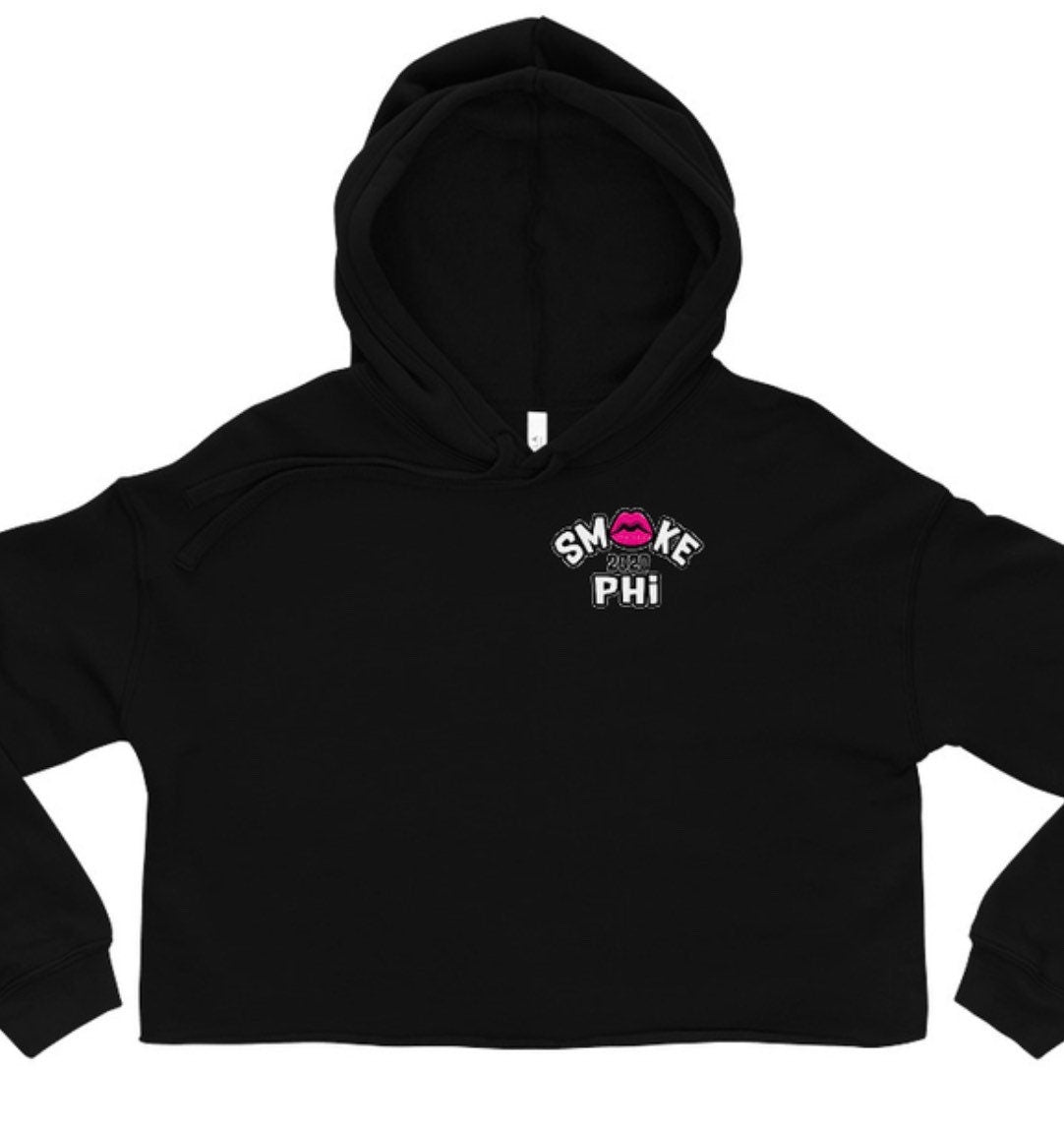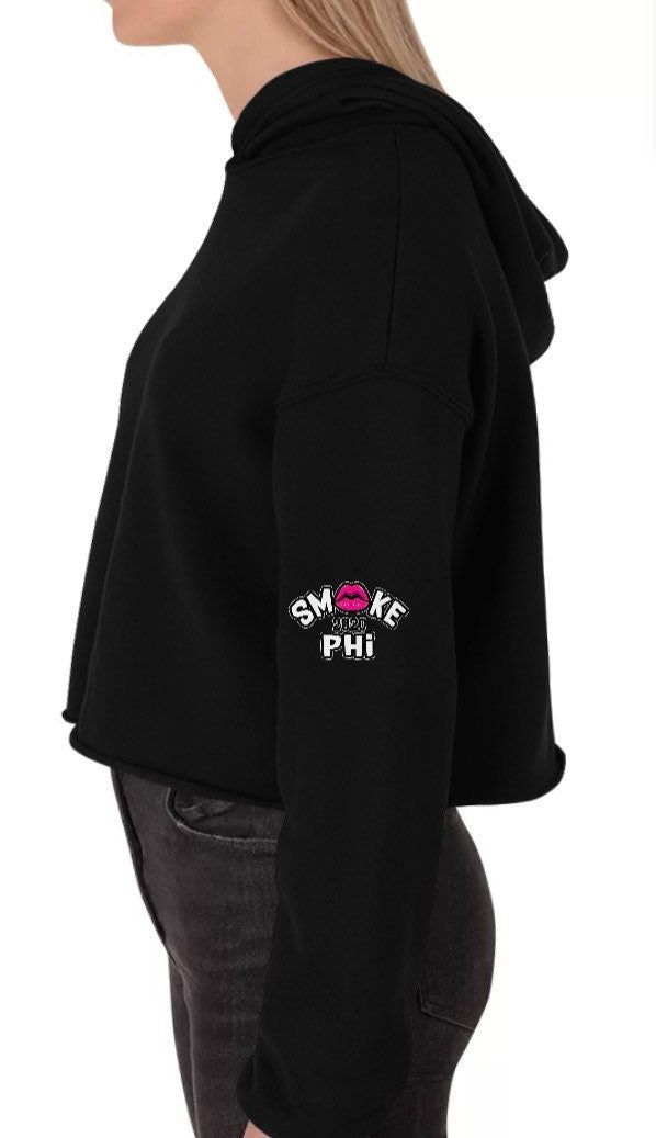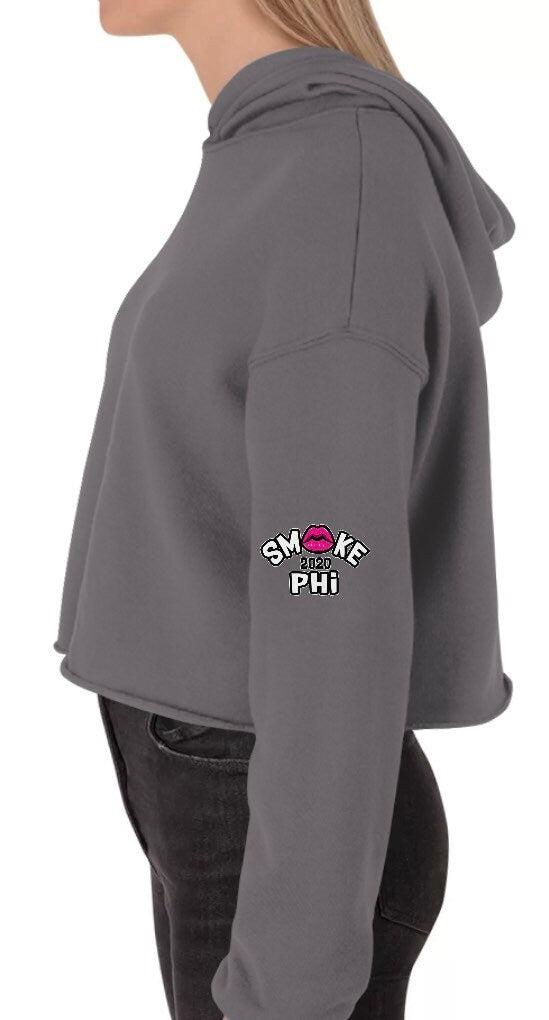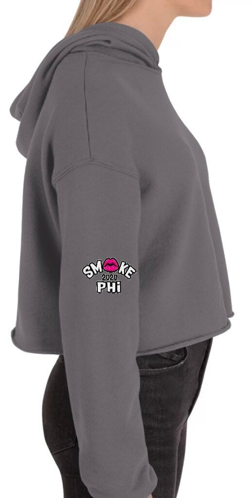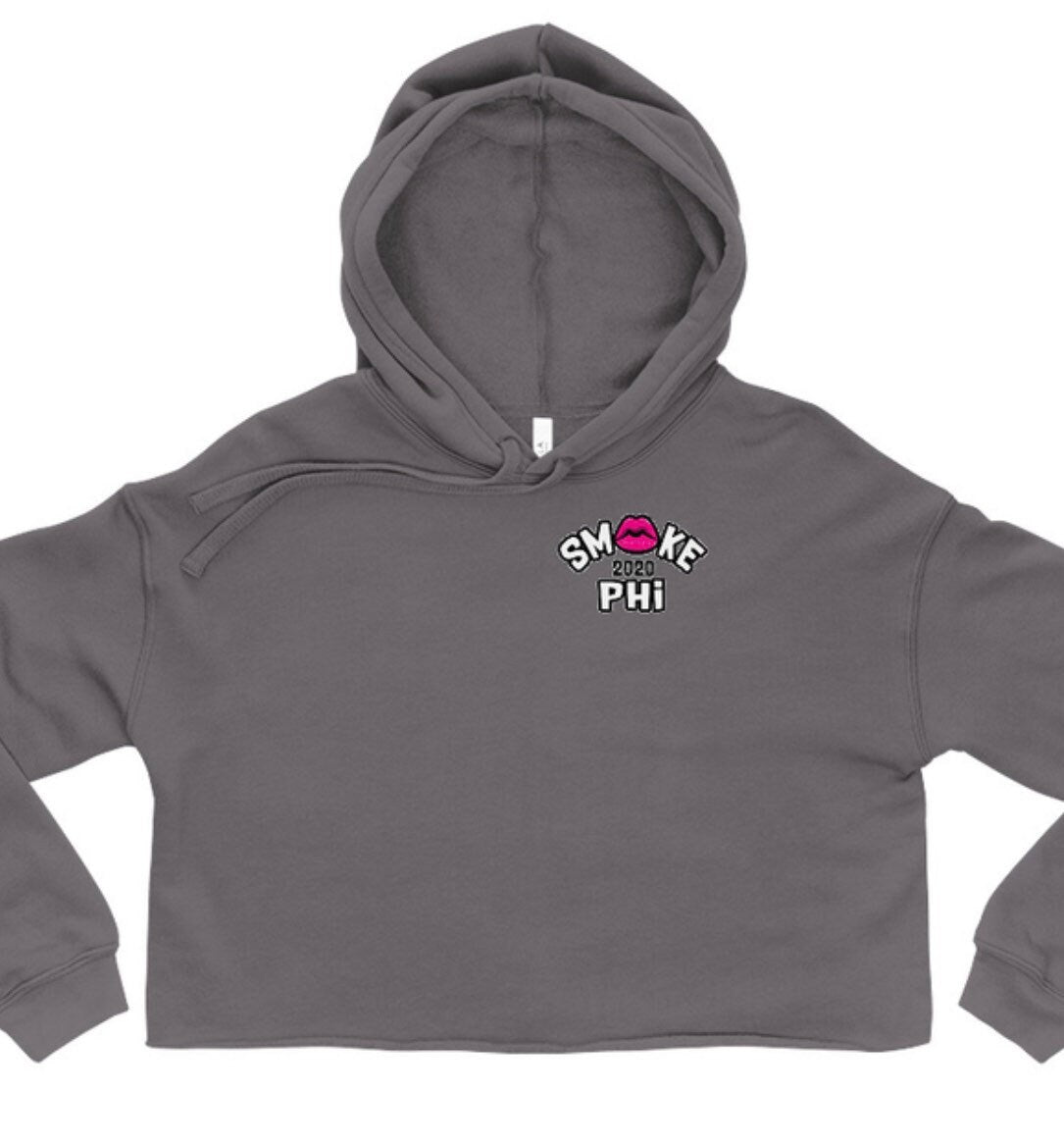 Enjoy this fresh black/gray graphic Crop top hoody with our pink Smokephi For Her logo. The logo is small in the upper left area on the front of the hoody, and it’s on the right and left sleeves.