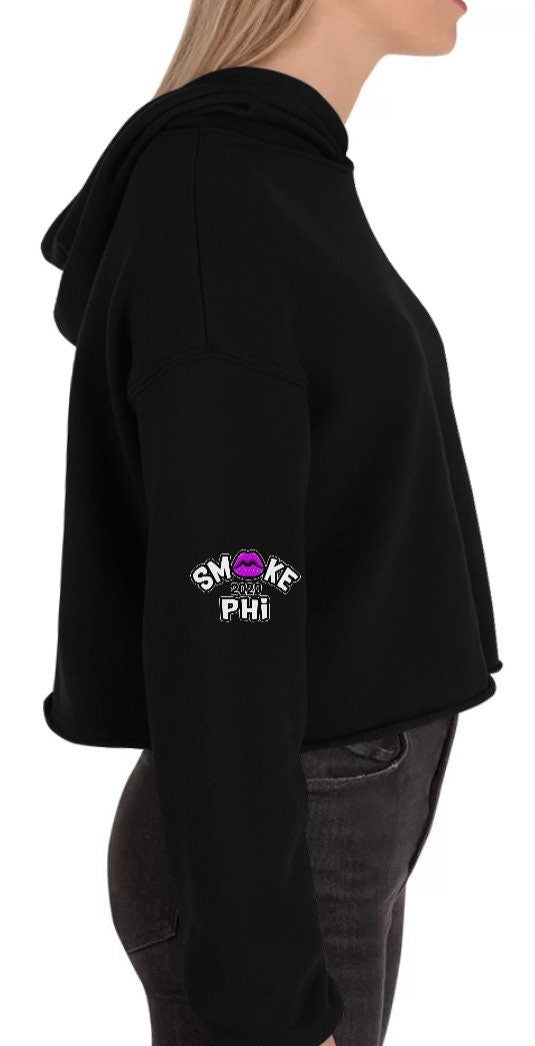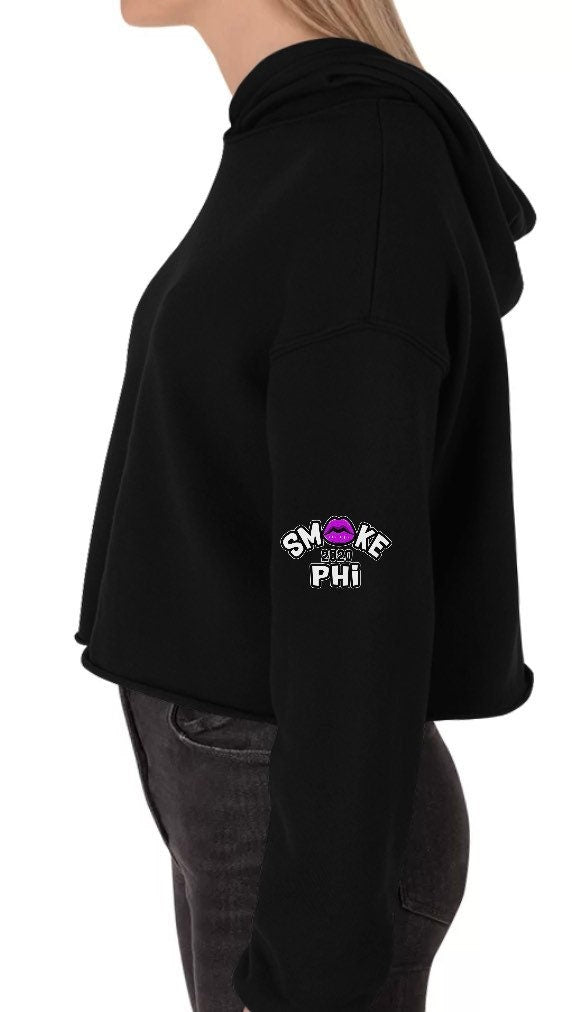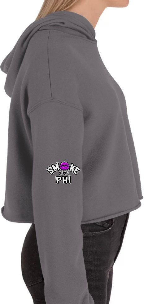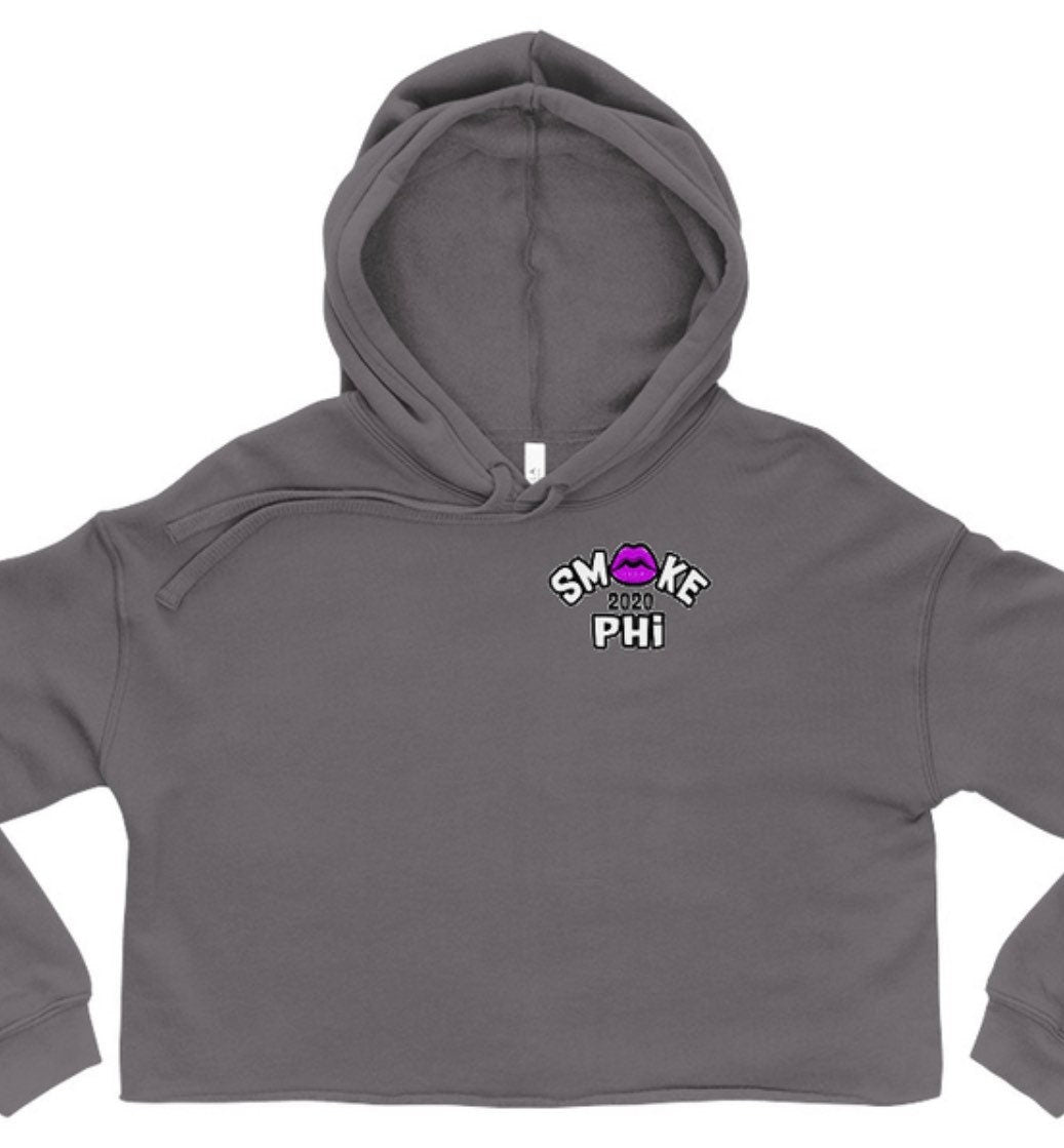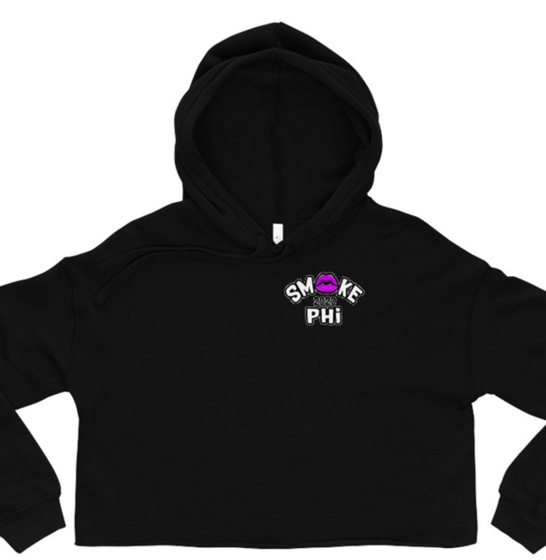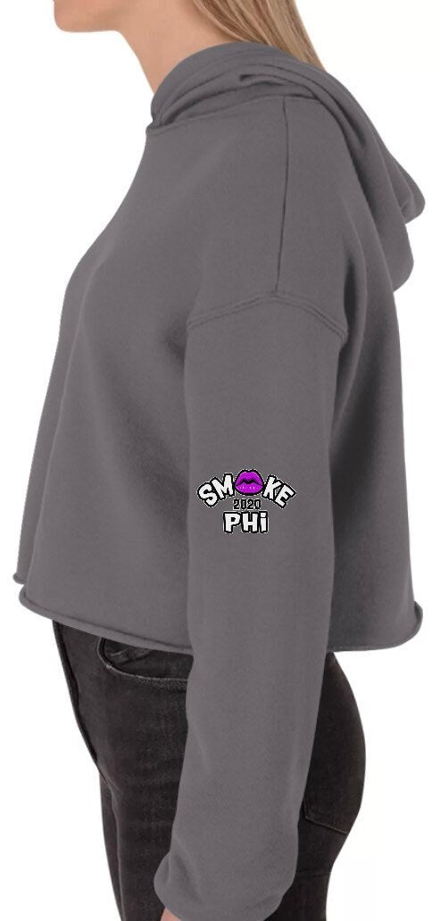 Enjoy this fresh black/gray graphic Crop top hoody with our purple Smokephi For Her logo. The logo is small in the upper left area on the front of the hoody, and it’s on the right and left sleeves.