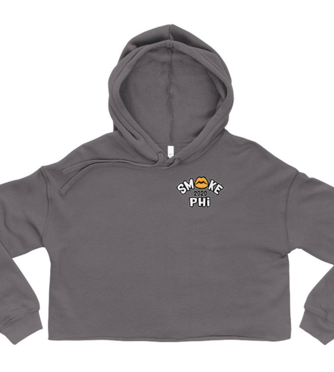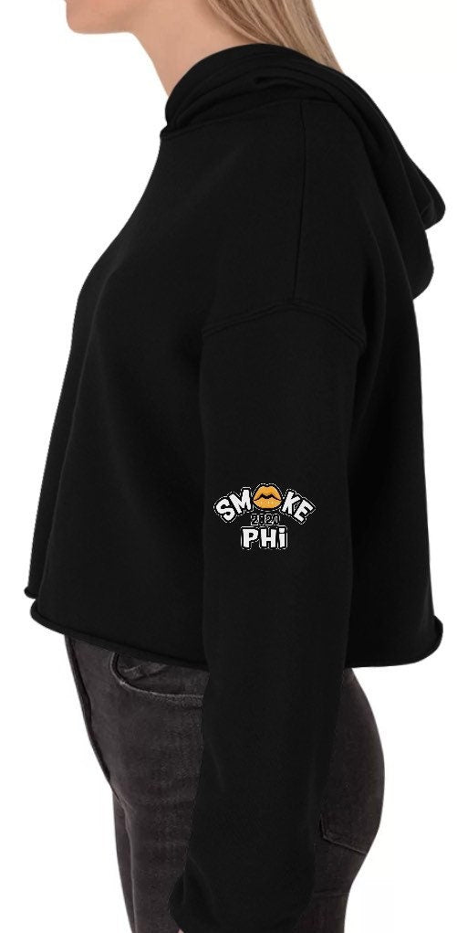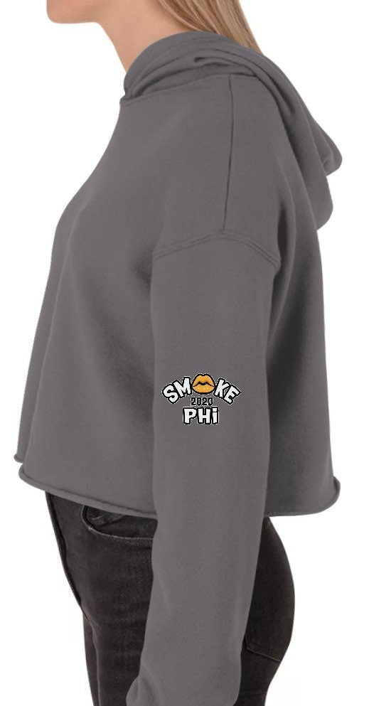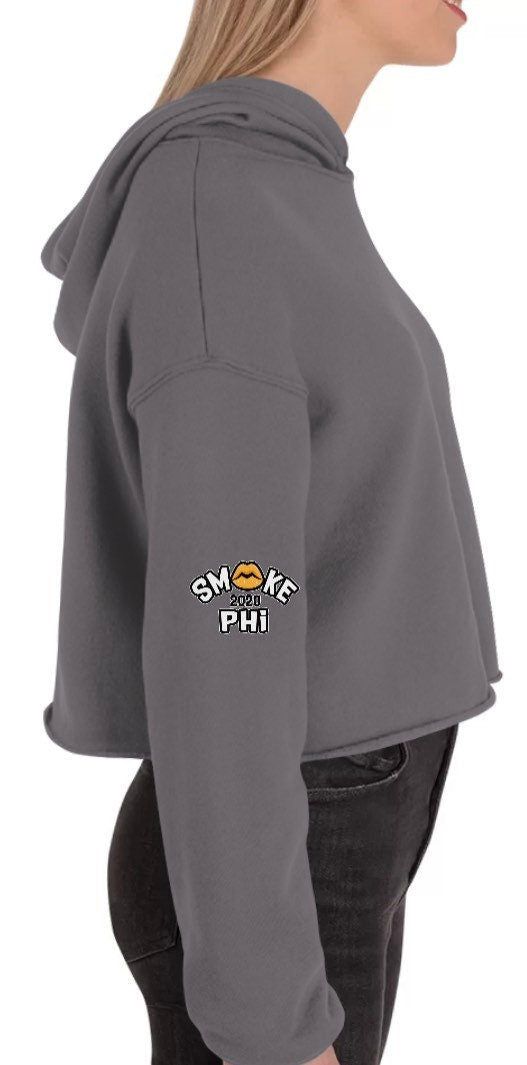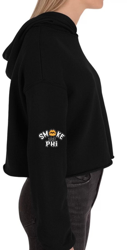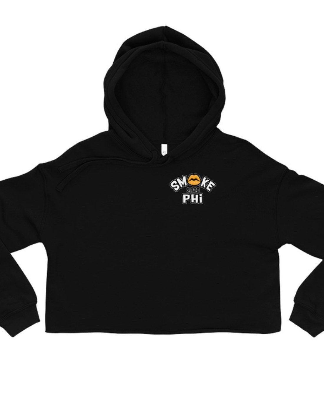 Enjoy this fresh black/gray graphic Crop top hoody with our yellow Smokephi For Her logo. The logo is small in the upper left area on the front of the hoody, and it’s on the right and left sleeves.