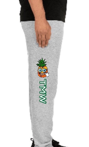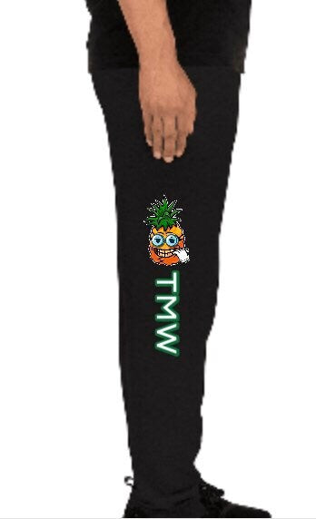 Enjoy our fresh, black/gray comfortable jogger pants with our Smokephi OG Pineapple logo. The pants are great for jogging, sleeping and relaxing in. The right leg has our Smokephi OG Pineapple logo, with the letters “TMW” (“The Major Way” in green) running down, and the left leg has the word “OG” (in green).
