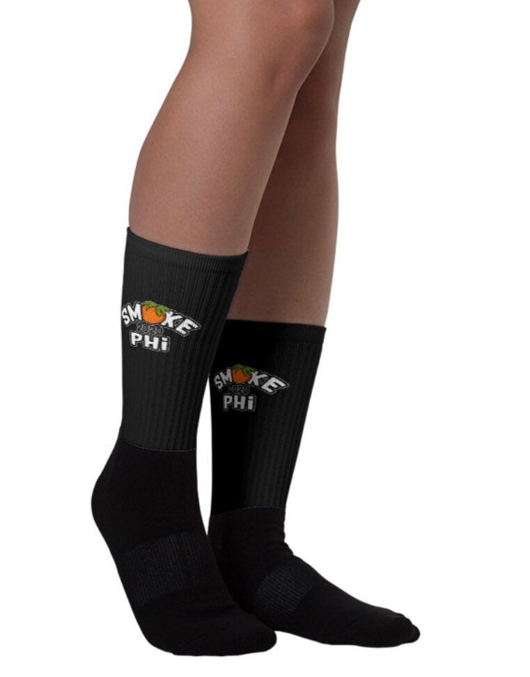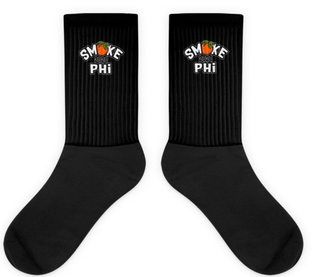 Enjoy these fresh, black socks with our Smokephi logo on them. The logo is on the left and right side of the sock. Our socks are made through sublimated fabric material, and they’re good for casual, formal and athletic wear.