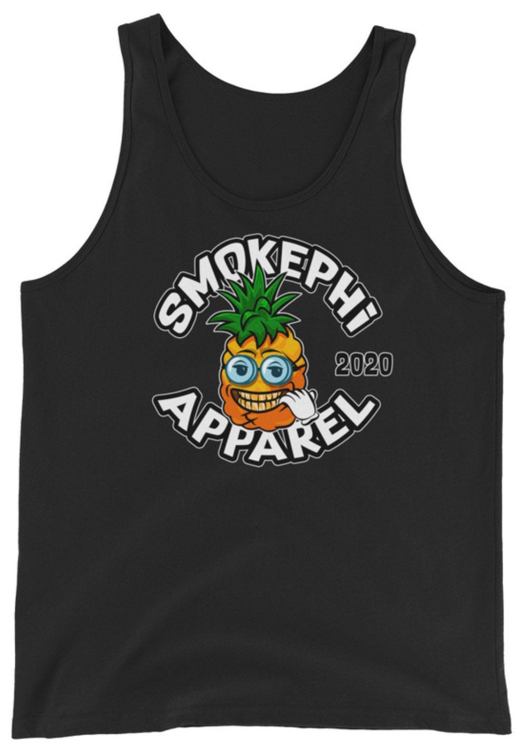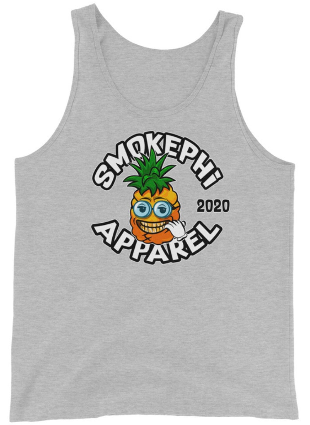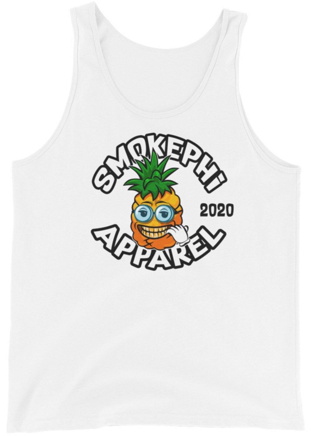 Enjoy this fresh white/black/gray graphic, tank tee with our OG Pineapple logo. The logo is big in the center area on the front of the tank.