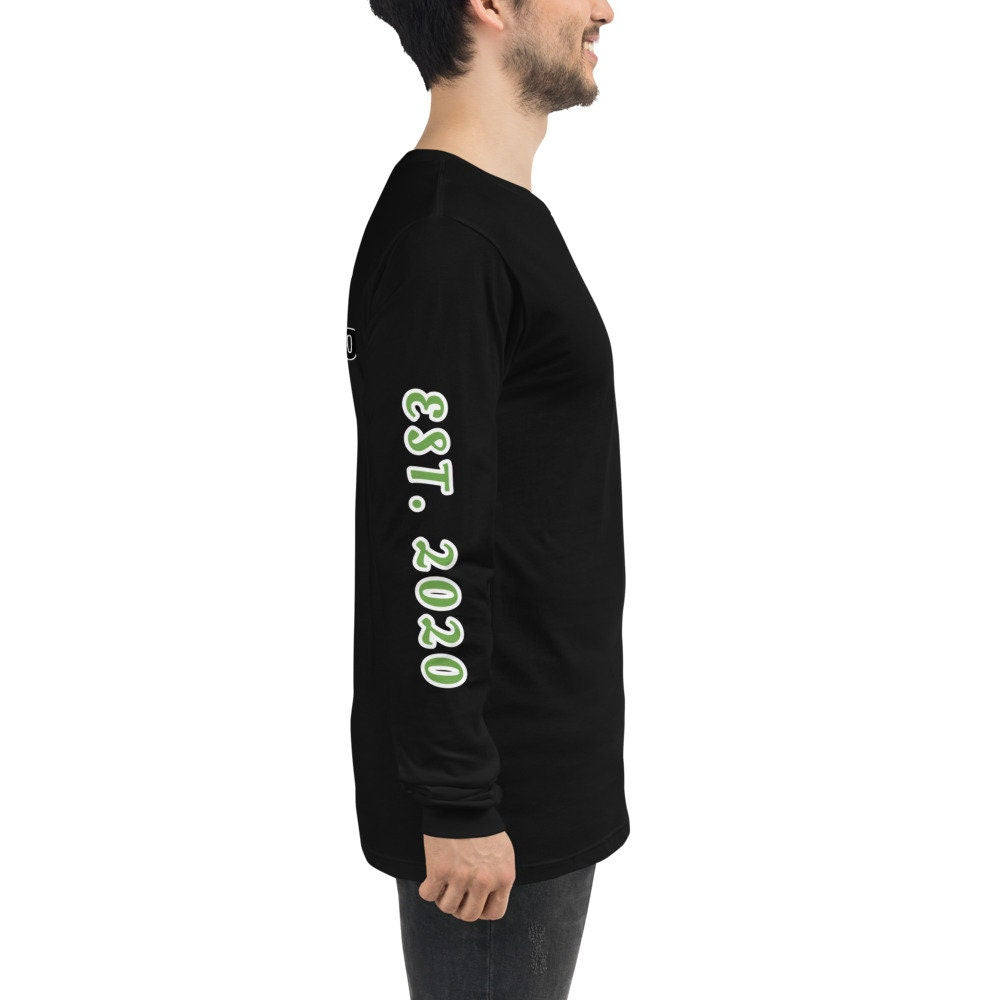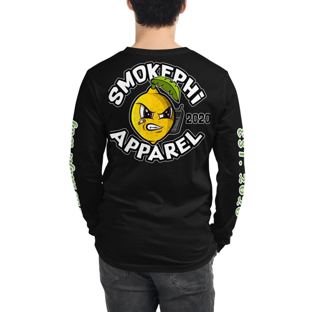 Enjoy this fresh black long sleeve graphic tee with our Smokephi Lemon logo. The logo is small in the top left area on the front of the shirt, and larger in the center area on the back of the shirt with our “Smokephi Apparel” branding phrase surrounding the lemon. The phrase “EST. 2020” (in green & white) runs down the right sleeve, and the phrase “The Major Way” (in green & white) runs up the left sleeve. Our full color combination (yellow/black/green/white) in our logos, creates a vintage blend of yellow on black.