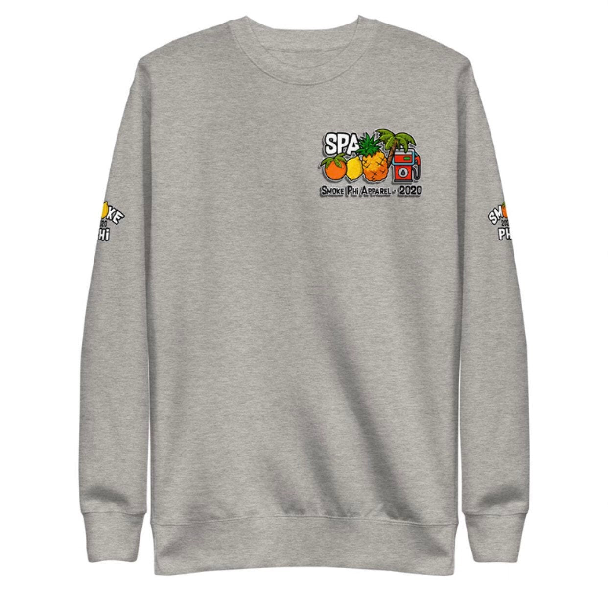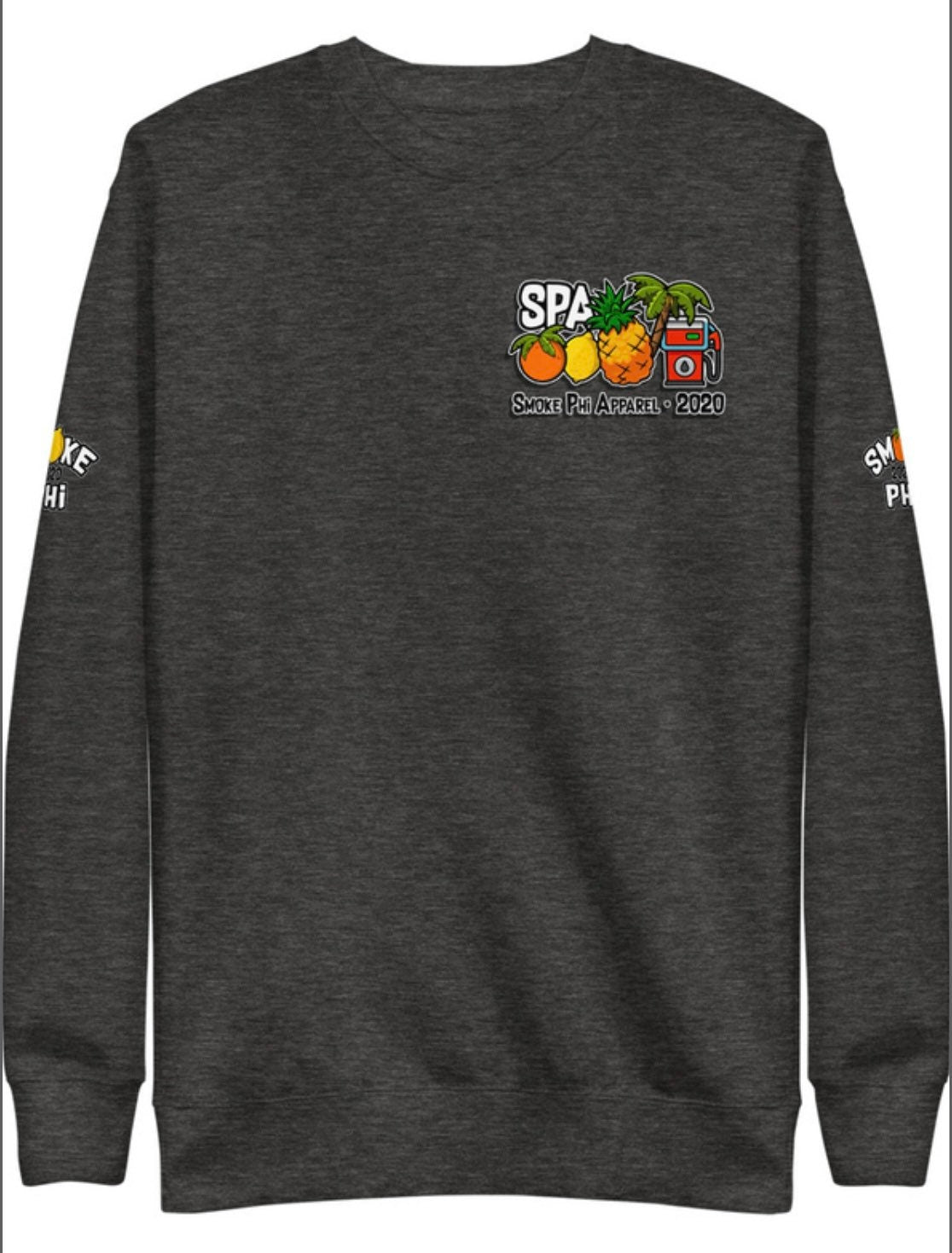 Enjoy this fresh black/gray/smoke gray crew neck sweater with our SPA Universal logo. The logo is small in the upper left area on the front of the sweater, with our Smokephi Lemon logo on the right sleeve and our Smokephi logo on the left.